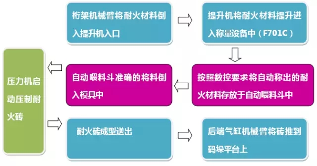 現(xiàn)有人工生產(chǎn)工藝為:粉料上料稱量—粉料倒入壓機(jī)模具—壓力機(jī)工作—取模—清潔模具—成品檢測,依托同類型鎂碳型耐火磚設(shè)計的全自動化生產(chǎn)線的經(jīng)驗(yàn),針對現(xiàn)有工藝進(jìn)行解決方案的定制。